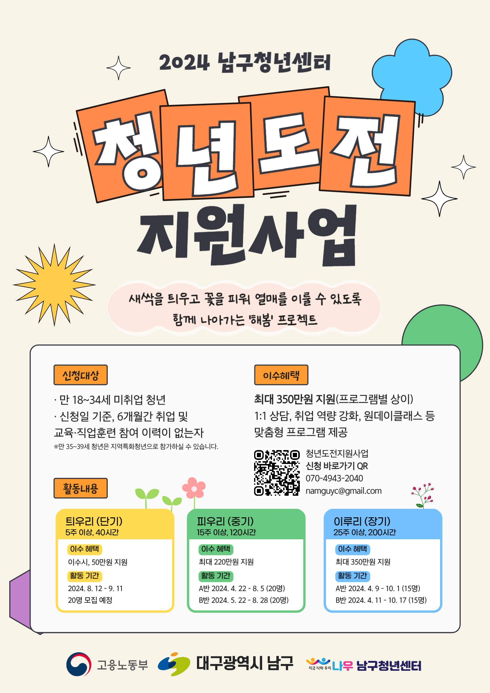 취업을 포기한 청년들에게 맞춤형 프로그램을 제공하여 자신감을 회복하고, 사회활동에 적극적으로 참여하며, 취업 의지를 높일 수 있도록 지원함으로써 노동시장 참여 및 취업 촉진을 지원하는 사업입니다. . 청년챌린지 지원사업 지원 대상자격(공통사항) 청년 18세~34세 1) 취업을 포기한 청년 신청일로부터 6개월 이상 취업, 직업훈련, 훈련 이력이 없는 자, 취업을 포기한 청년 설문조사 결과 21점(30점 만점) 이상 청년2) 자립을 준비하는 청년(졸업아동) 보호)청소년복지시설에서 6개월 이상 보호받고 제대 또는 제대 예정인 청소년3) 탈북청소년탈북청소년(탈북자 등록확인서 제출) 4) 만나지 못하더라도 그 밖에 청소년위원회 요구사항 중 지원이 필요한 경우 참여하실 수 있습니다. 청년구직급여를 받고 있으나 참여할 수 없는 경우 구직급여 지급 종료일로부터 6개월 이내인 경우 고용보험 가입자 고등학생, 대학생 등 청년도전 지원사업 프로그램 및 지원금